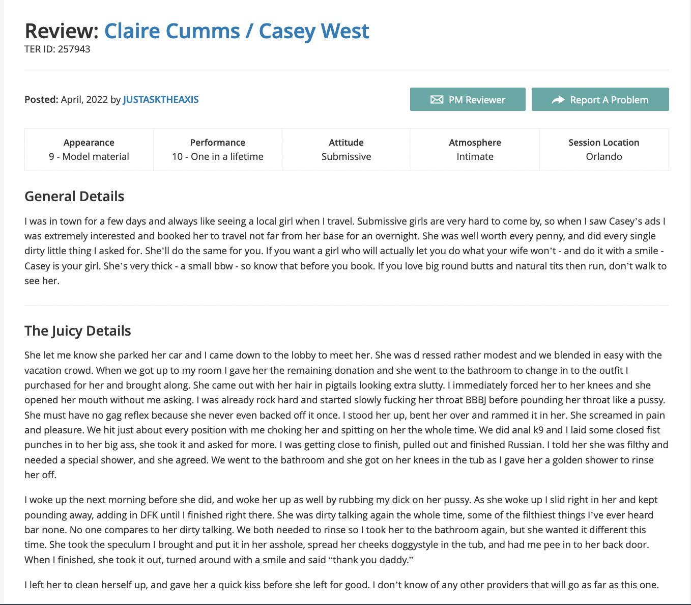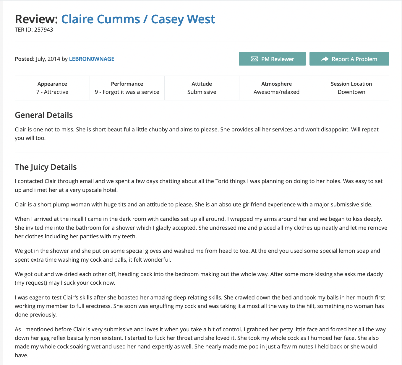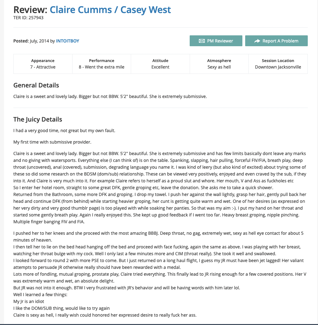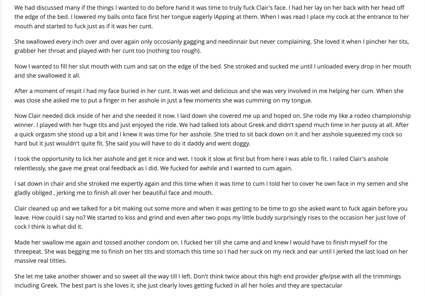 analinus = licking anus, Asian = analingus, oral sex to the anus, Asian Cowgirl = girl on top, squatting, ATM = ass to mouth, BJ = blow job = oral sex = fellatio, BBBJ = bare back blow job, oral sex without condom, BBBJTC = bare back blow job to completion (in mouth), BBBJTCIM = bare back blow job to completion in mouth, BBBJTCWS = bare back blow job to completion with swallow, BBBJWF = bare back blow job with facial, BBFS = bare back sex, CIP = cum in pussy, CIA = cum in ass, BDSM = bondage, discipline, sado-masochism, CFS = covered full service, Sex with condom, CG = cowgirl = girl on top facing you, CIM = cum in mouth, Cowgirl = CG = girl on top facing you, DATY = dining at the y = cunnilingus, oral sex performed on a woman, DDP = double digit penetration, kitty and anus, Doggie = man behind girl, girl on hands and knees, DFK = deep french kissing, open mouth with tongue, DT = deep throat, facial = cumming on partner's face, FBSM = full body sensual massage, FIV = finger in vagina, FOV = finger outside vagina, French = BJ, or oral sex in general, French Kiss = Kissing with tongue insertion, FS = full service, GFE = girlfriend experience, Greek = anal sex, back door, GS = golden shower = urination play (receiving Only, no mouth or face), GSM = g-spot massage, HJ = hand job = a manual / hand release, Italian = penis rubbing between butt cheeks, LK = light kissing, closed mouth, Mish = missionary position, MP = multiple pops = multiple releases, MSOG = multiple shots on goal = multiple releases, OWO = oral without condom, OWOTC = oral without condom to completion, PIV = penis in vagina, RCG = girl on top facing away, RPG = role playing games, Russian = penis rubbing between breasts = Pearl Necklace = titty fuck, teabag = man squats and dips balls in partner's mouth, TUMA = tongue up my ass, giving and receiving, bare camel slide, vaginal stretching, large insertions, fisting, double fisting, anal fisting, toys, large toys, bondage, slapping, light punching, degradation, humiliation, Daddy/daughter, Master/slave, 1950’s household, NO BRUISING or PERMANENT MARKS.